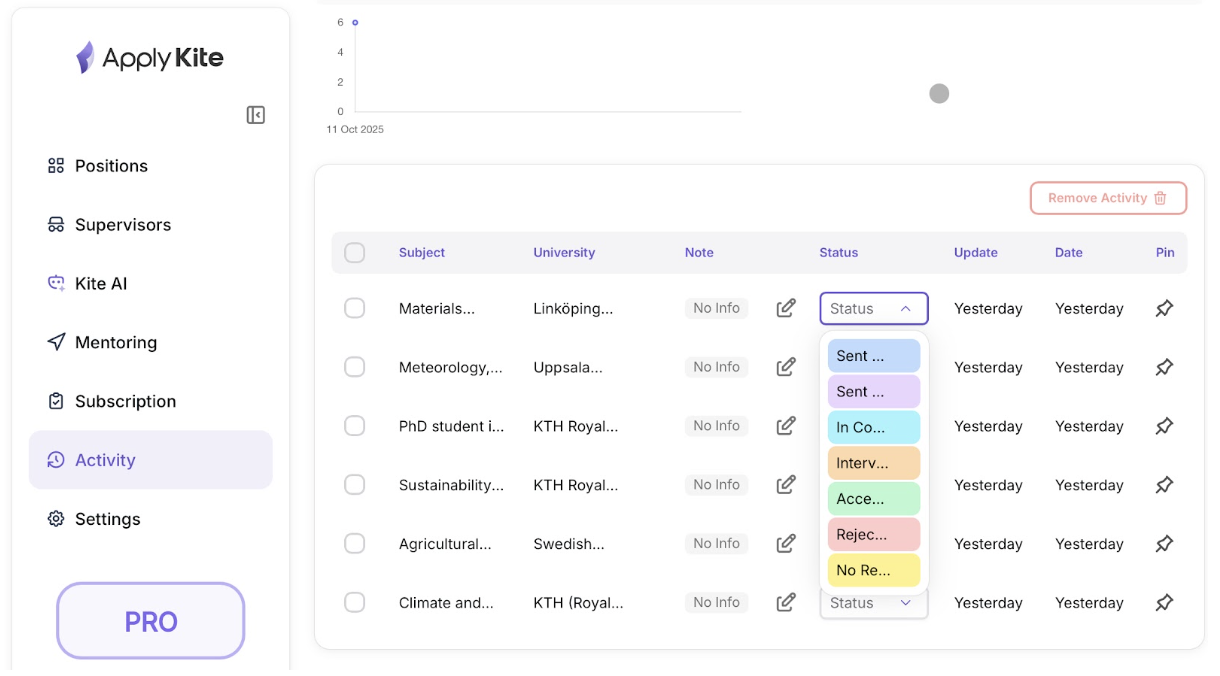 By using the Activity tab, I tracked every single PhD position I saved — from the first email to the interview — without ever needing Excel or Google Sheets.