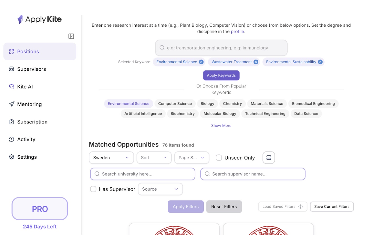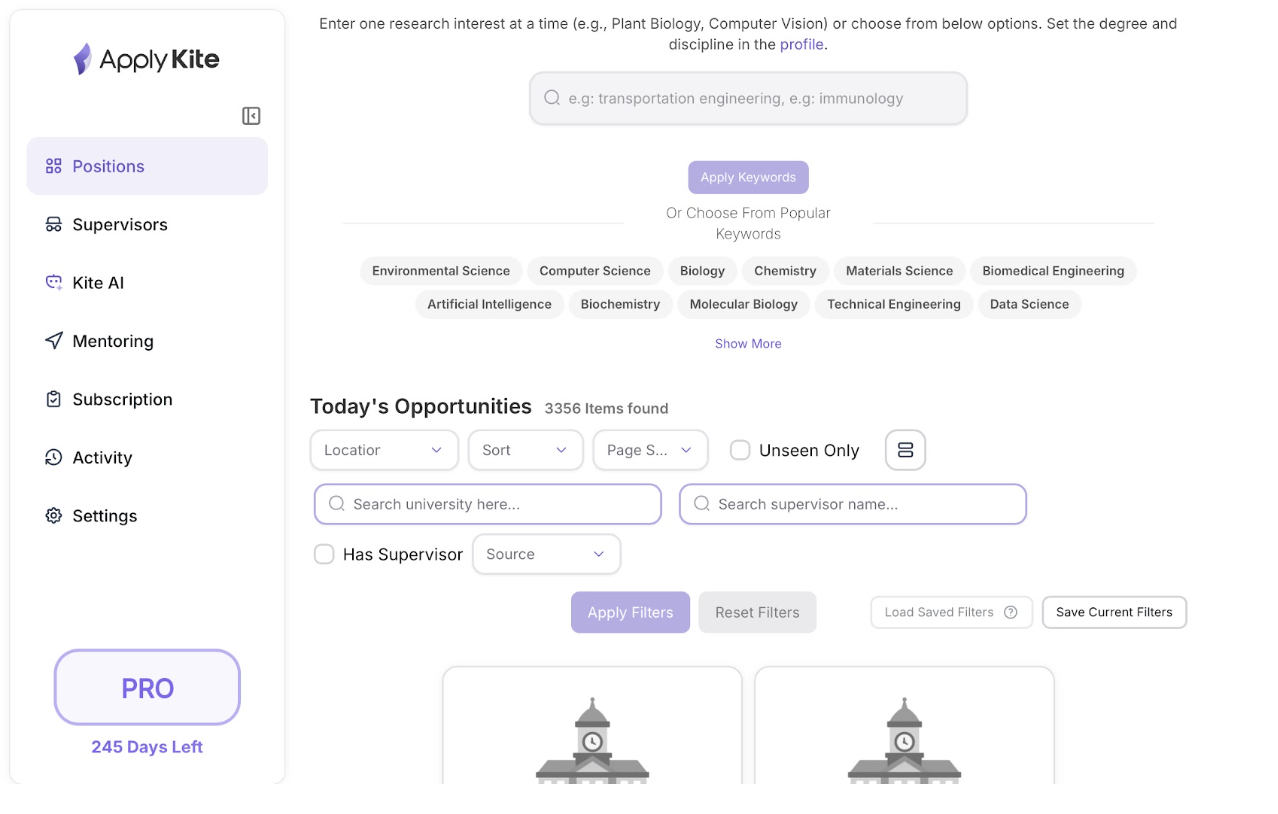 در ابتدا هزاران موقعیت دکترا از رشتهها و کشورهای مختلف نمایش داده میشد — که طبیعی است قبل از اعمال فیلترها.