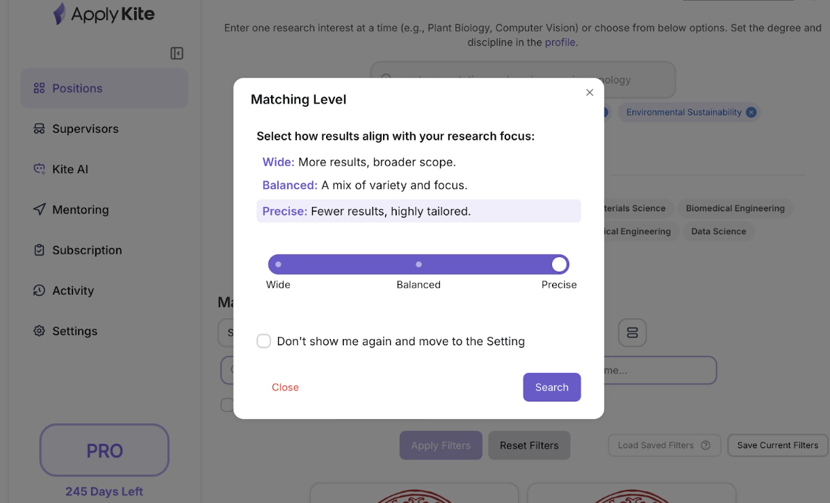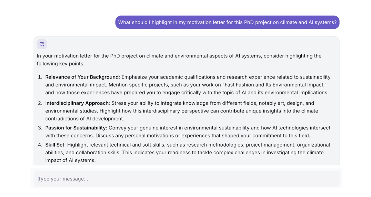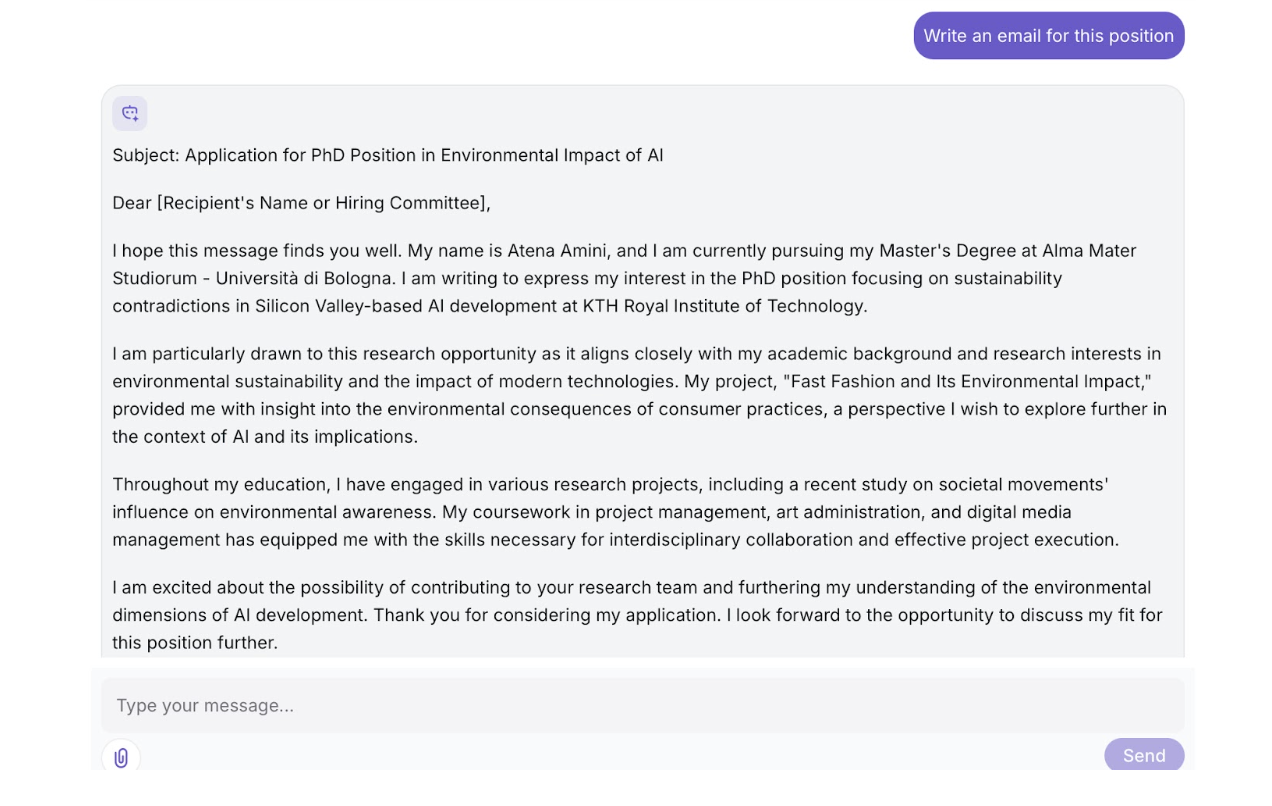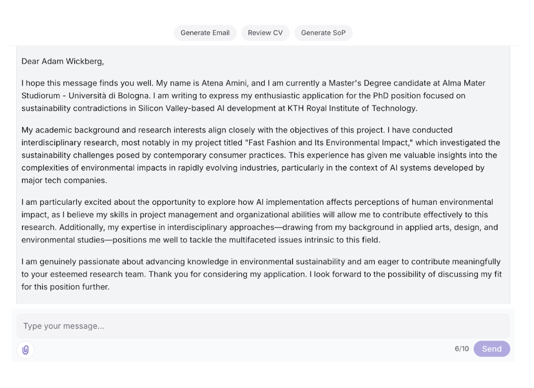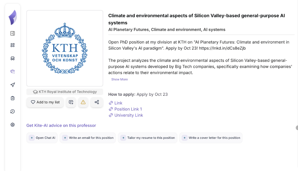 بعد از بررسی موقعیت و ارتباط با استاد، از Kite AI برای آمادهسازی تمام مدارک اپلیکیشنم مستقیماً از همان صفحه استفاده کردم.