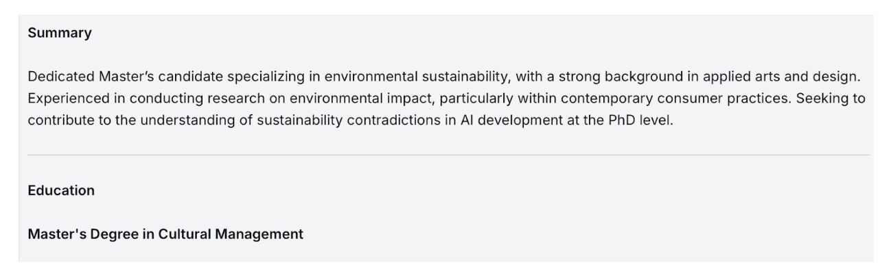 Kite AI رزومه را تحلیل کرد و تجربههای مرتبط با محیطزیست و پایداری را برجسته کرد.