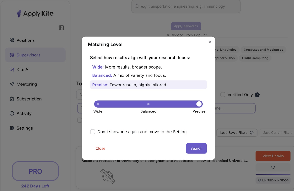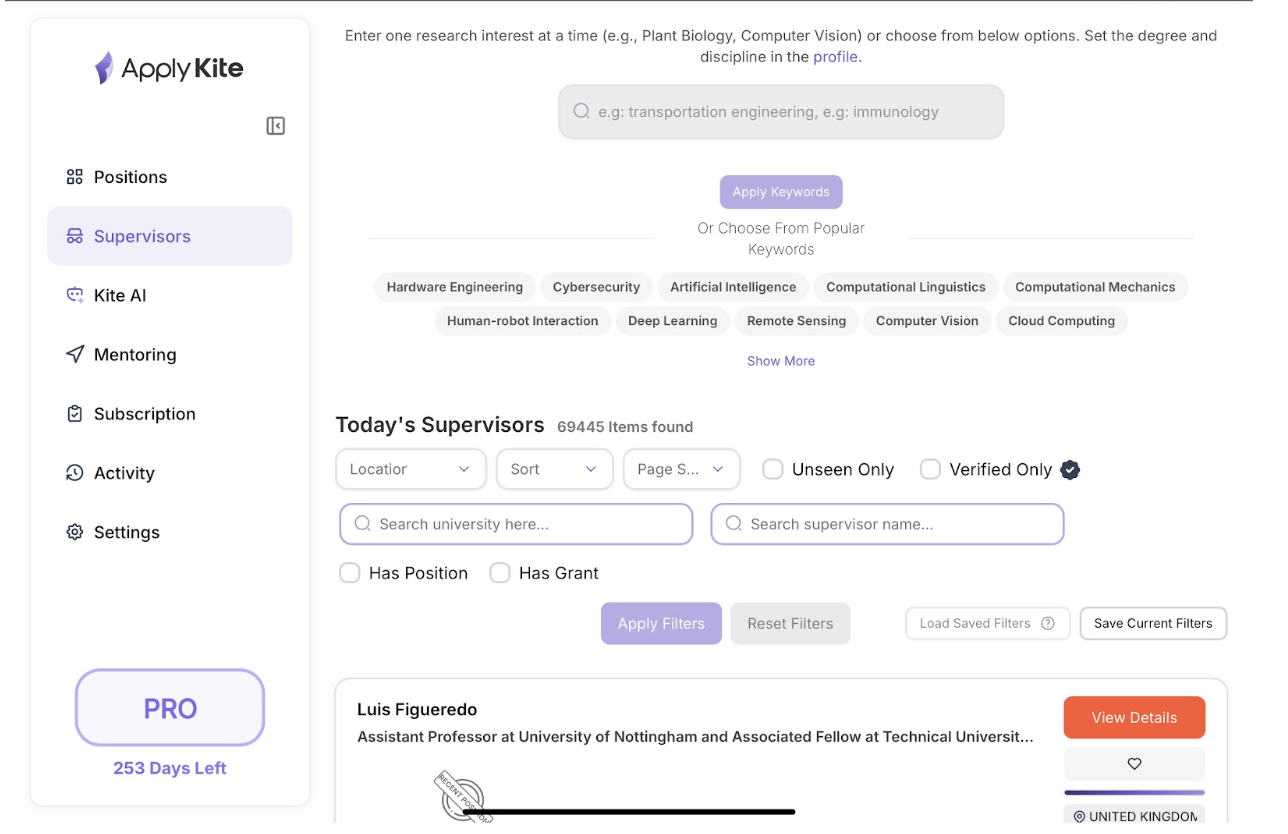 این تنظیم کمک میکند ApplyKite داشبورد من را شخصیسازی کند تا در تب Supervisors فقط استادانی را نشان دهد که به فرصتهای پژوهشی سطح دکترا در علوم کامپیوتر و حوزههای مرتبطی مثل علم داده (Data Science)، یادگیری ماشین (Machine Learning) یا هوش مصنوعی (AI) مربوط هستند.