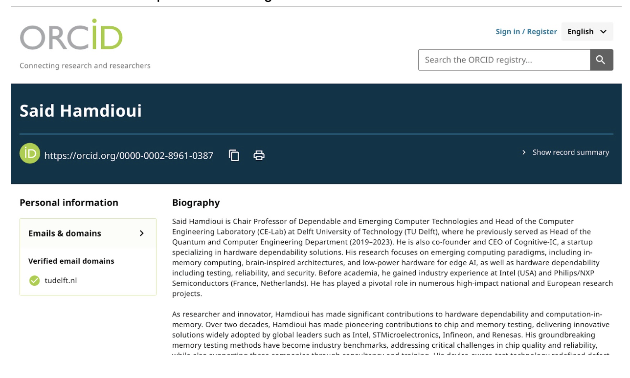 بعد از اعمال همهی فیلترها، یکی از بهترین تطابقها پروفسور سعید حمیدیوی (Prof. Said Hamdioui) از Delft University of Technology (TU Delft) بود.