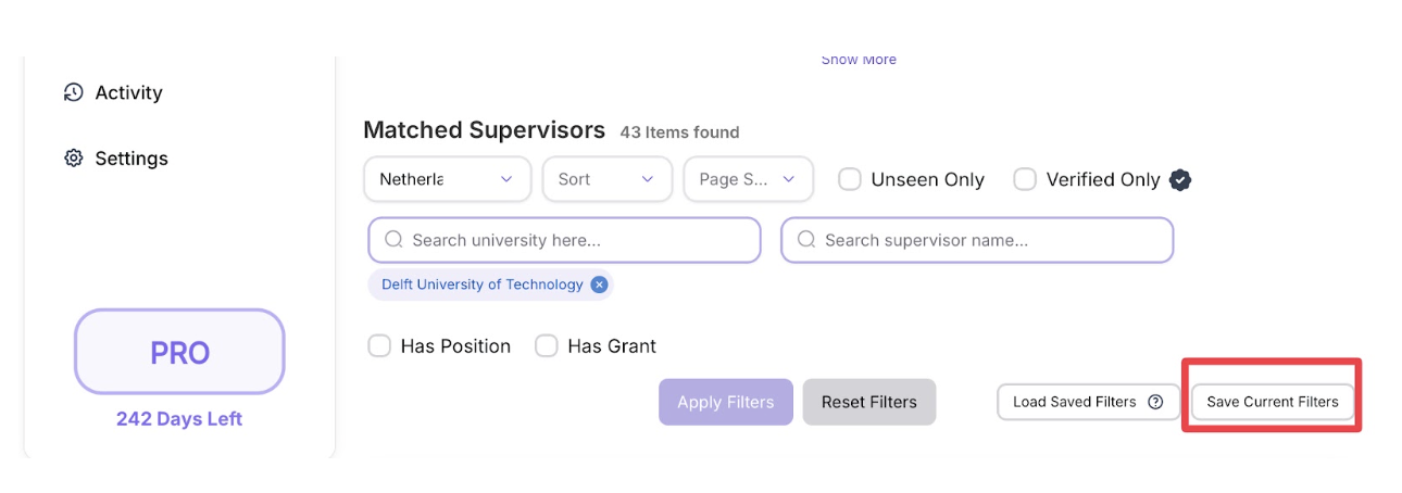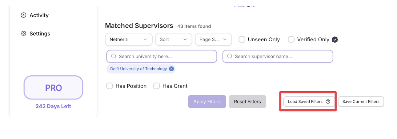 دفعهی بعد که وارد شدم، فقط روی “Load Saved Filters” زدم، فیلتر ذخیرهشده را انتخاب کردم و همان فهرست استادان فوراً ظاهر شد — دقیقاً از همانجایی که قبلاً متوقف شده بودم.