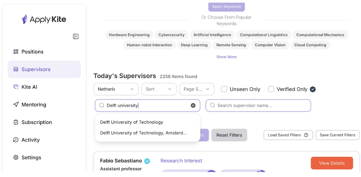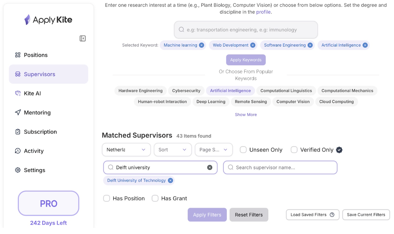 با ApplyKite از یک جستوجوی جهانی و گسترده به فهرستی دقیق از استادانی رسیدم که پژوهششان کاملاً با پیشزمینهام در علوم کامپیوتر و یادگیری ماشین همراستاست.