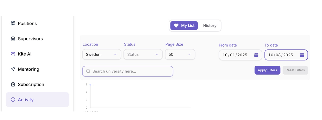 بعد از پیدا کردن و ذخیرهی موقعیتهای دکترا که بهشان علاقهمند بودم (مثل موقعیتهای KTH و Chalmers)، آنها بهصورت خودکار در بخش Activity در پنل سمت چپ ظاهر شدند.