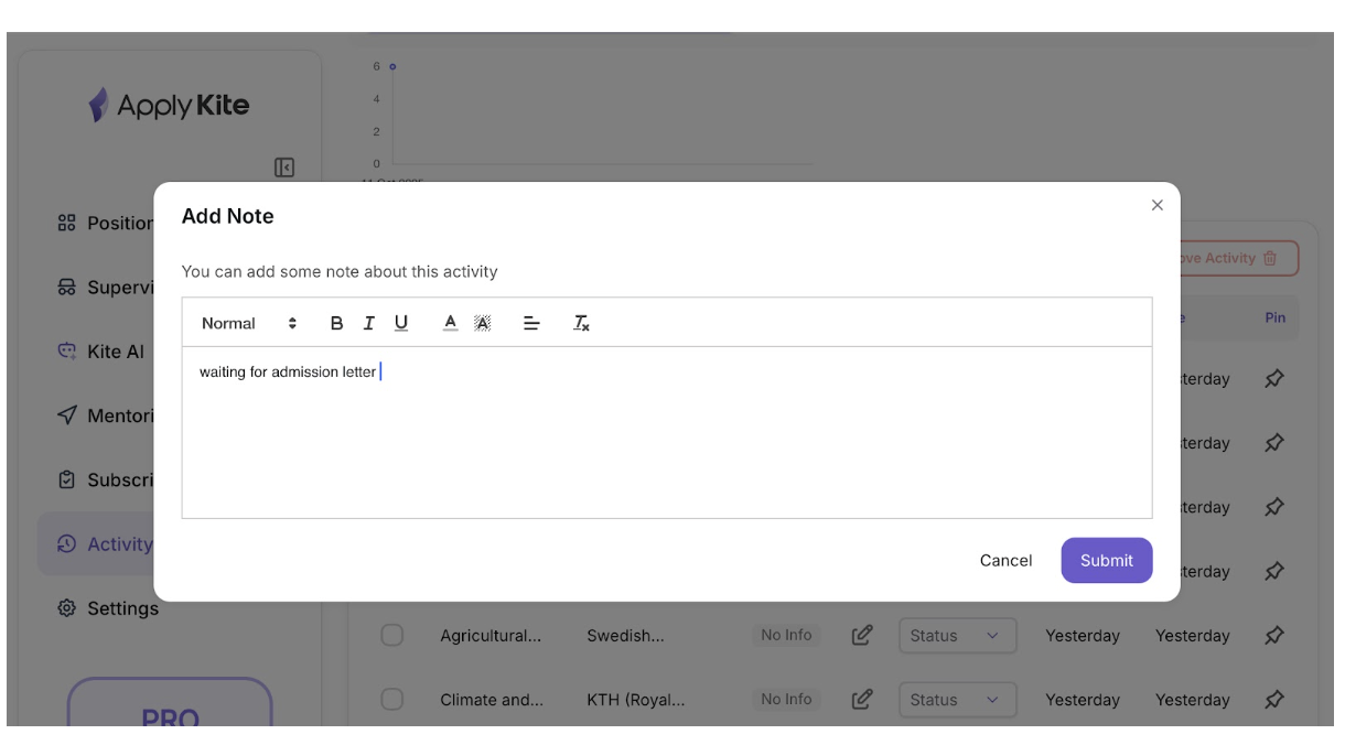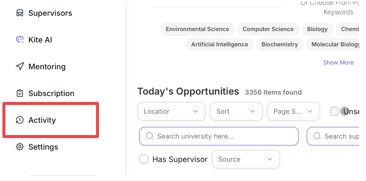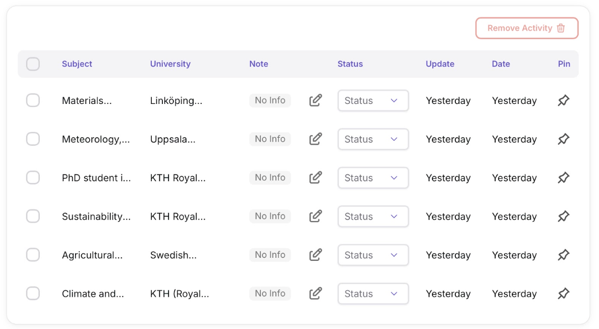 با استفاده از تب Activity، توانستم تمام موقعیتهای دکترایی را که ذخیره کرده بودم — از اولین ایمیل تا مصاحبه — پیگیری کنم، بدون حتی یک فایل اکسل یا گوگلشیت.